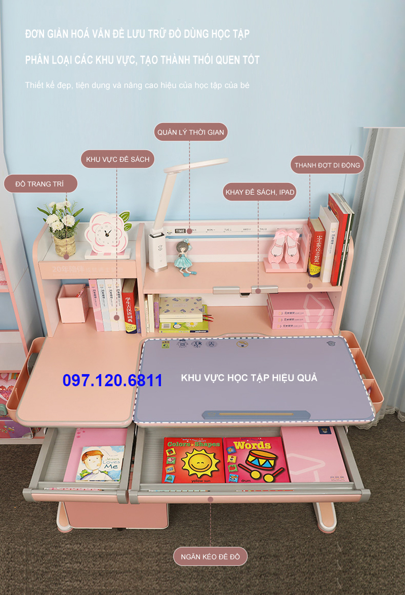 Nơi học tập luôn ngăn nắp gọn gàng khi sử dụng mẫu bàn học chống gù nâng hạ độ cao này