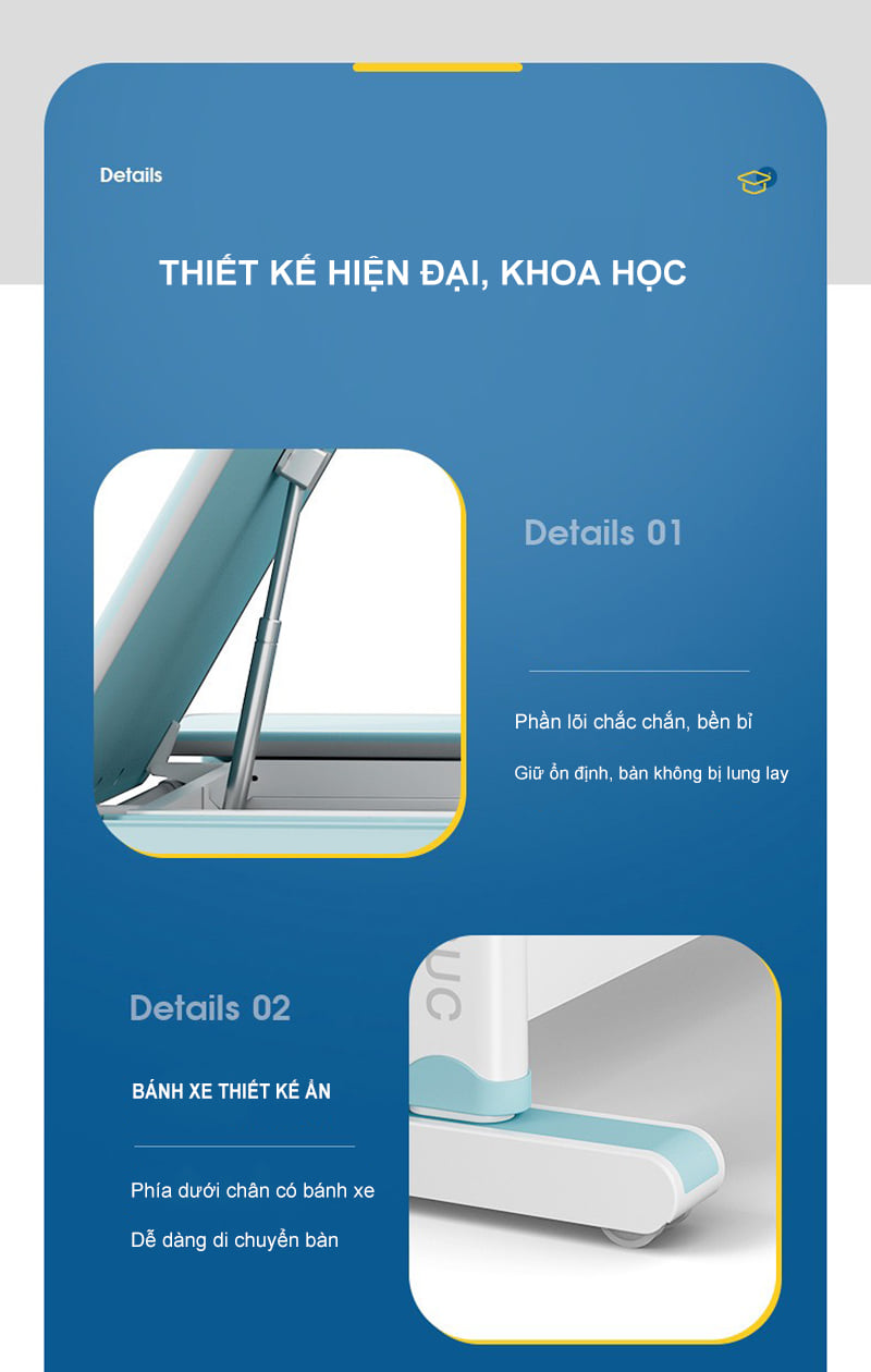 Phụ kiện : Kệ sách, ngăn bàn, giá đặt sách/ipad, chặn sách, móc treo cặp, đồng hồ hiển thị độ nghiêng, chân bàn có bánh xe di chuyển.