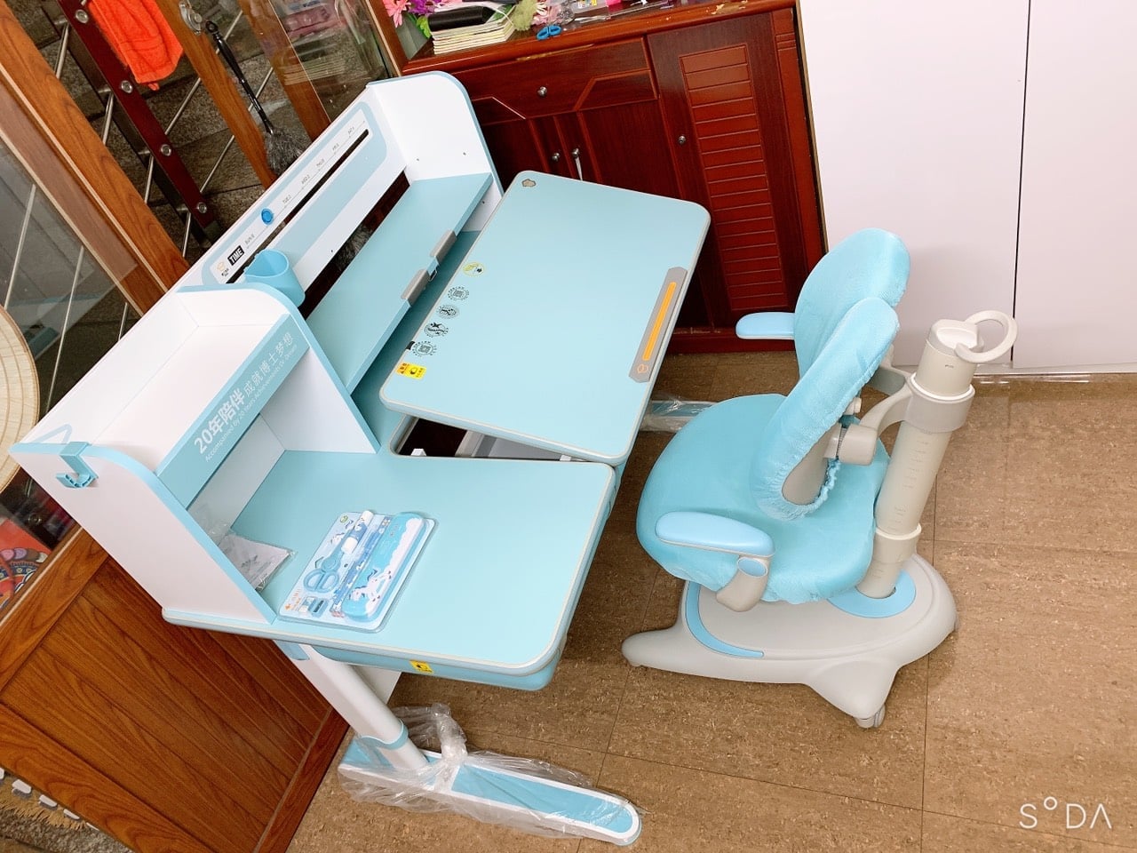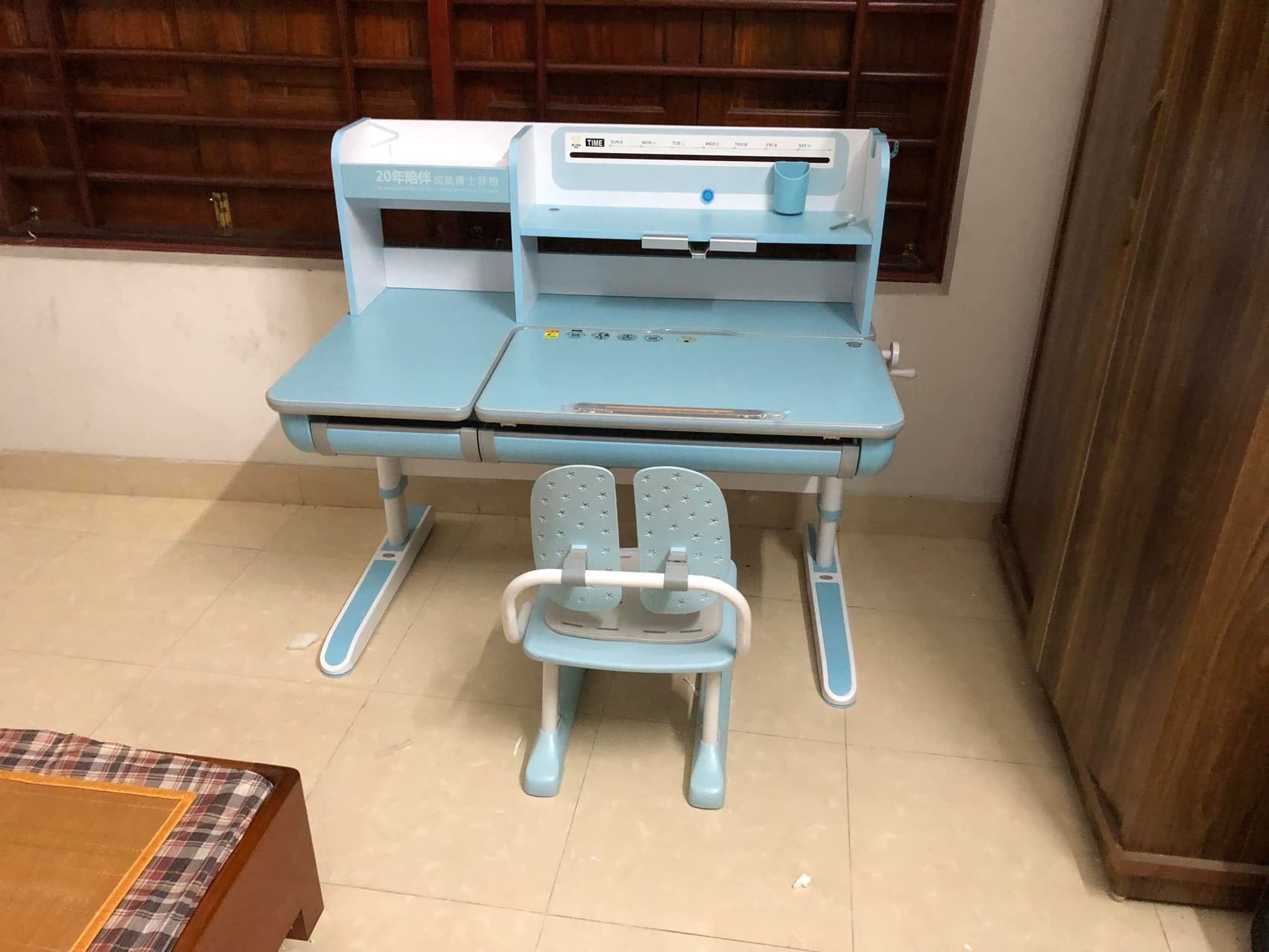Bộ bàn học cho bé màu xanh cực xịn, nếu giữ gìn dùng được lúc đi lớn lên đi làm vẫn dùng được
