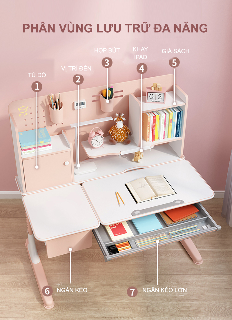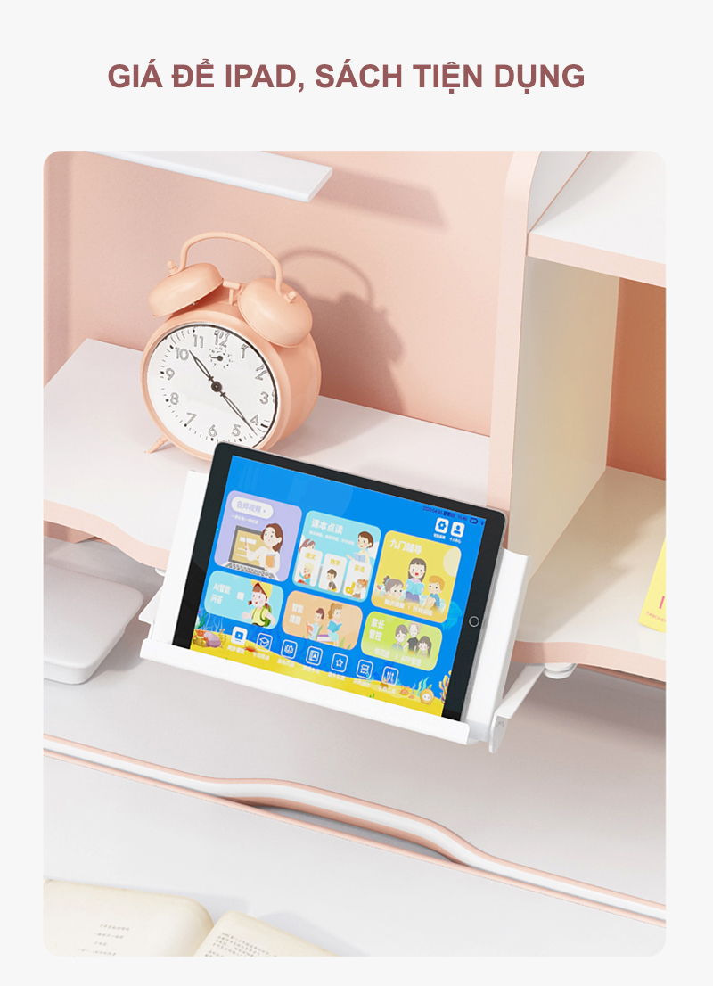 Phụ kiện : Kệ sách, ngăn bàn, giá đặt sách/ipad, hộc đựng đồ, chặn sách, móc treo cặp, ống đựng bút, đồng hồ, tủ giá sách.