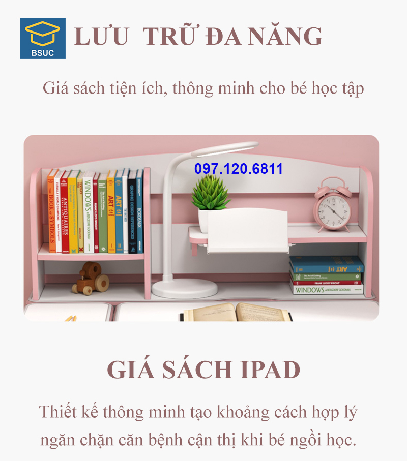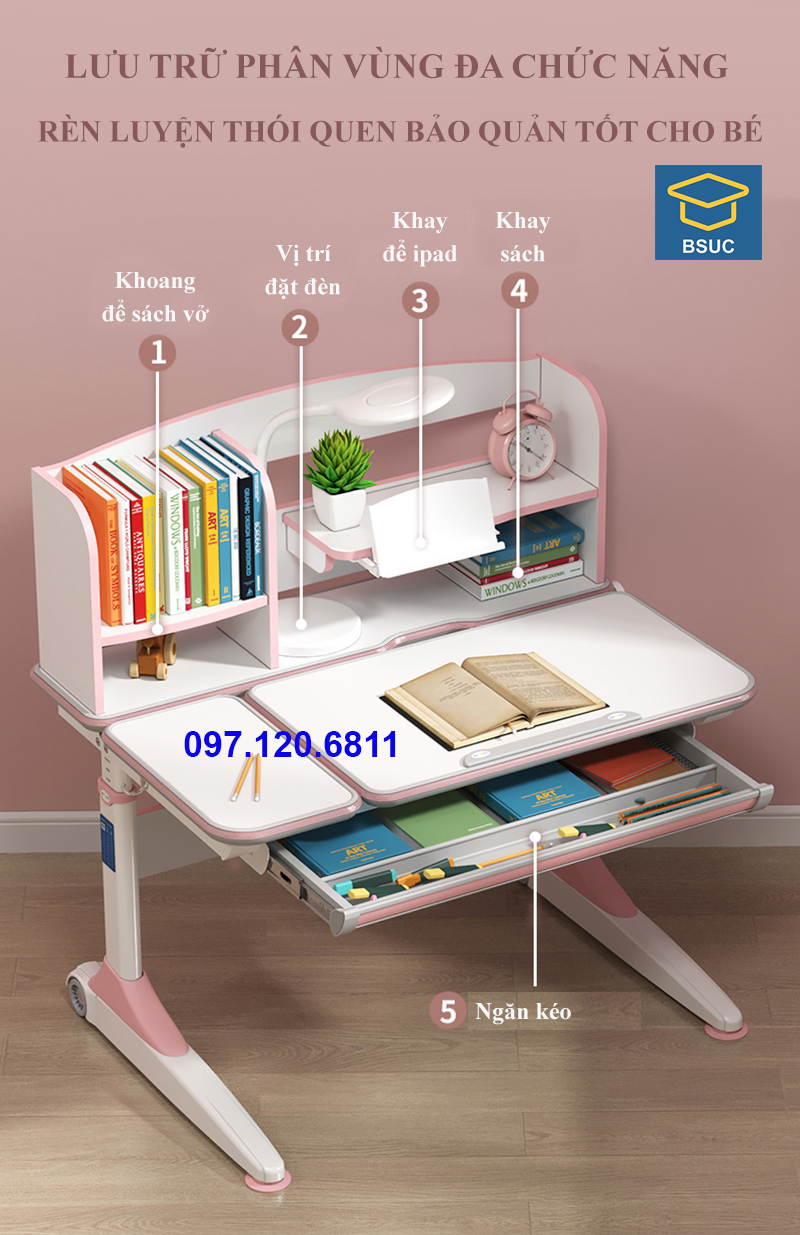 Phụ kiện : Kệ sách, ngăn bàn, giá đặt sách/ipad, chặn sách, móc treo cặp, đồng hồ hiển thị độ nghiêng, chân bàn có bánh xe di chuyển.